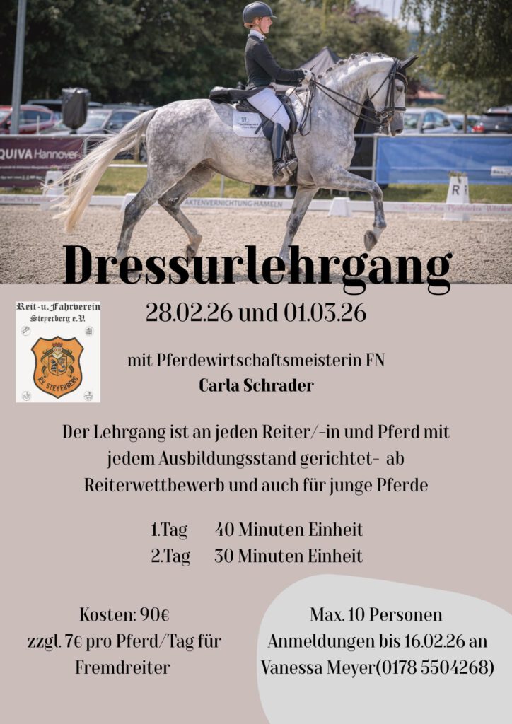 Bitte meldet Euch zum offiziellen Teil, mit Angabe der Personenzahl, bis Freitag den 29.09. entweder per E-Mail info@rfv-steyerberg.de oder telefonisch unter 0162-7902845 an.