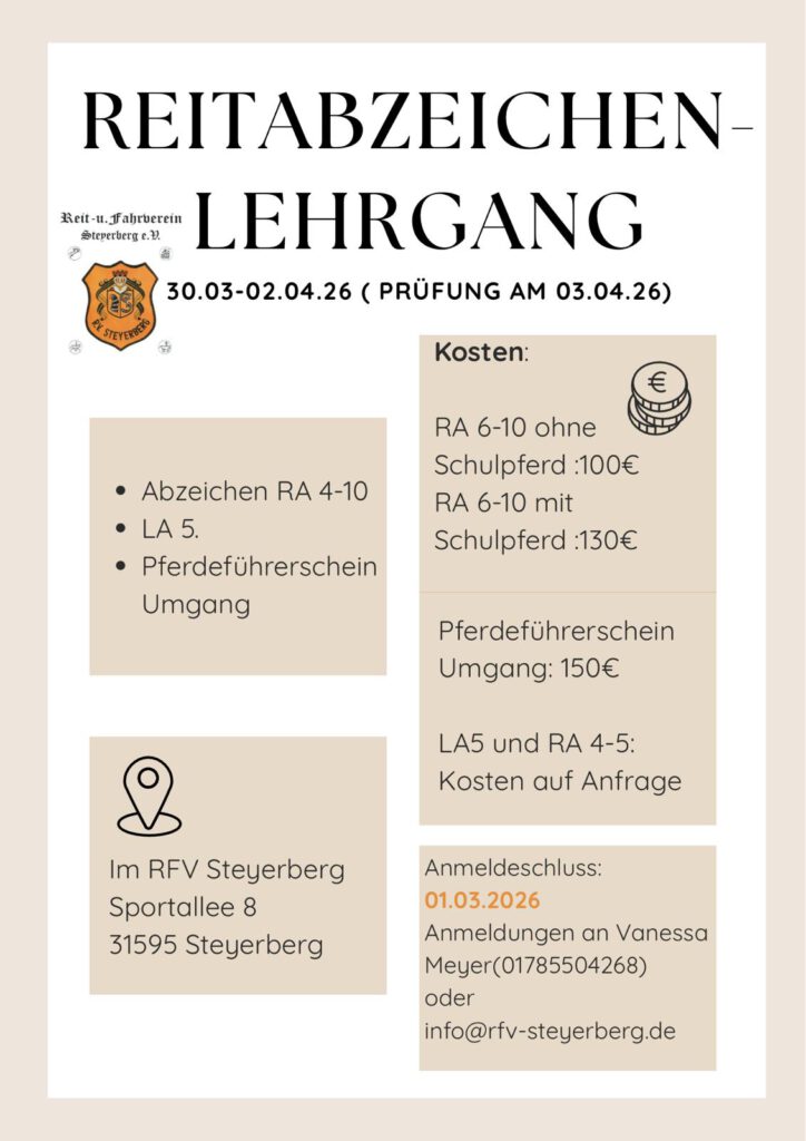 Bei uns findet in diesem Jahr in den Osterferien wieder ein Reitabzeichenlehrgang statt. Ihr werdet umfassend auf die Abschlussprüfung vorbereitet, wir bieten euch: Trainingseinheiten in Dressur- und Springen, Bodenarbeit sowie Theorie.